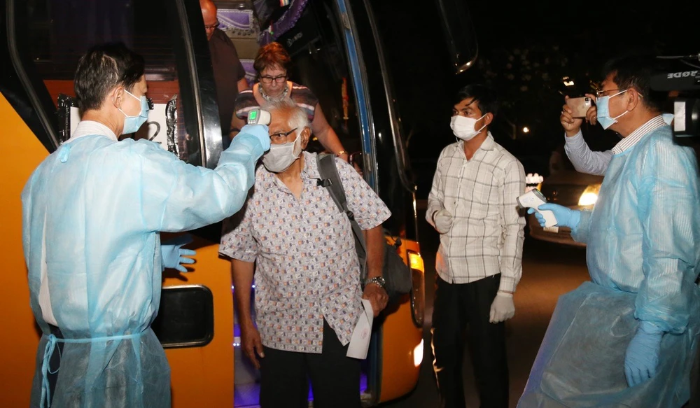 Nhân viên y tế Campuchia kiểm tra thân nhiệt cho các du khách từ du thuyền Westerdam. Ảnh: TÂN HOA XÃ