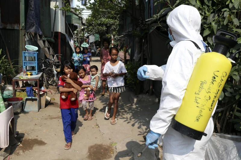 Nhân viên y tế Campuchia yêu cầu người dân vào nhà để họ tiến hành xịt thuốc khử trùng nhằm ngăn chặn COVID-19 ở Phnom Penh. Ảnh: AP