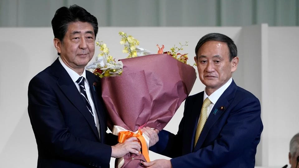 Cựu Thủ tướng Nhật Shinzo Abe và thủ tướng kế nhiệm Yoshihide Suga. Ảnh: TRTWORLD