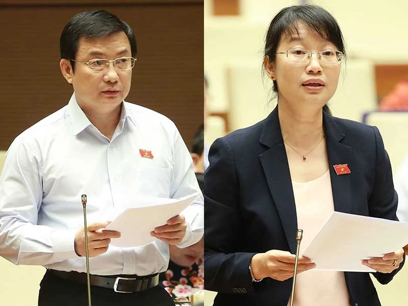 ĐBQH tỉnh Bình Dương Phạm Trọng Nhân và ĐBQH TP.HCM Trần Thị Diệu Thúy phát biểu tại hội trường QH sáng 27-11. Ảnh: TTXVN