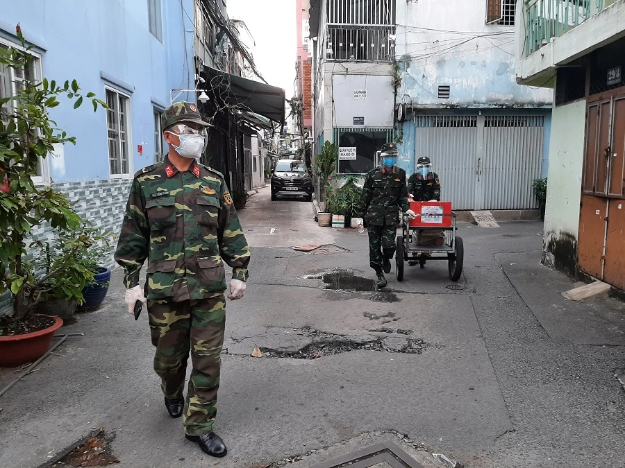 Cán bộ phường 5, quận Tân Bình cùng lực lượng bộ đội chuẩn bị phần đến trao cho các F0 trên địa bàn phường. Ảnh: NH