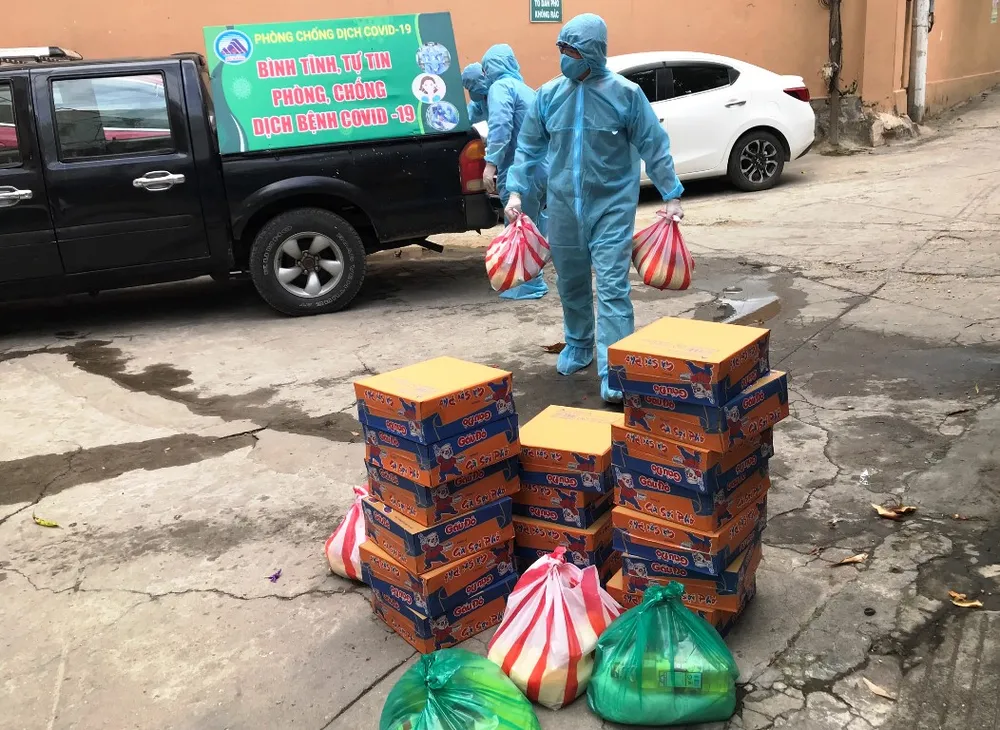 Cán bộ phường tập kết hàng hóa trong khu phong tỏa để chuẩn bị trao quà. Ảnh: HẢI HIẾU