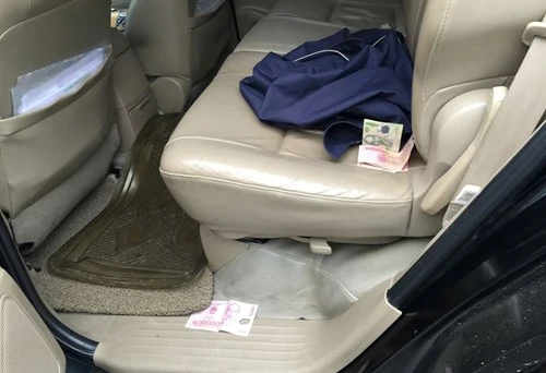 Công an huyện Nghi Xuân (Hà Tĩnh) phát hiện, thu giữ tiền vương vãi trong xe công 37A-5969. Ảnh: Kh.Phạm