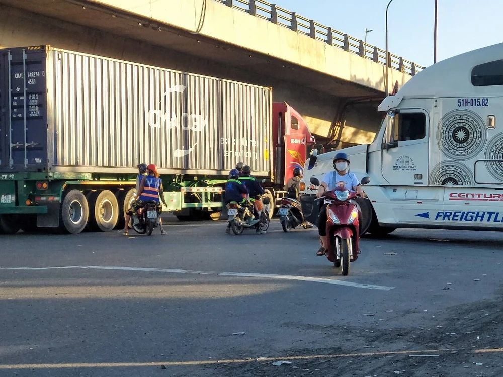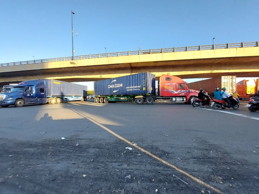 Theo ghi nhận, lượng container ra vào cảng Cát Lái đông đúc nên khu vực thường xuyên ùn tắc kéo dài.
