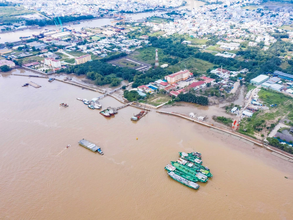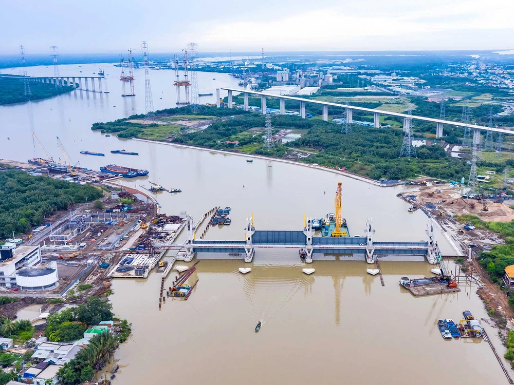Cống ngăn triều Mương Chuối nhìn từ trên cao với 4 van ngăn triều và cả âu thuyền đã dần hoàn thiện.