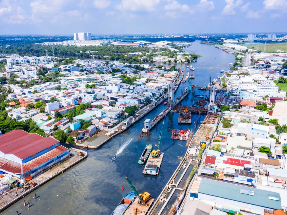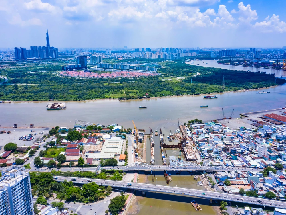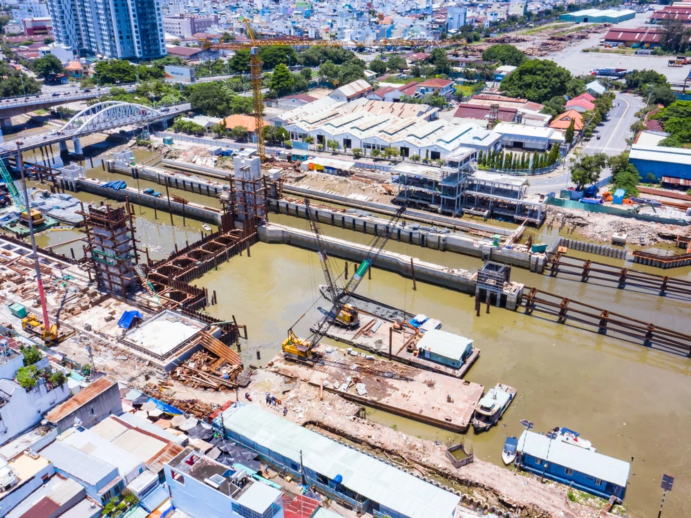 Dự án chống ngập 10.000 tỉ đồng là dự án thủy lợi, thuộc Quy hoạch 1547, được Thủ tướng phê duyệt nhằm chống ngập úng với giải pháp kiểm soát triều cường và chủ động hạ thấp mực nước kênh trục. Trong ảnh là cống ngăn triều Tân Thuận (quận 4, 7) nằm cửa ngõ Kênh Tẻ vào TP.HCM. Phía đối diện là khu đô thị Thủ Thiêm.