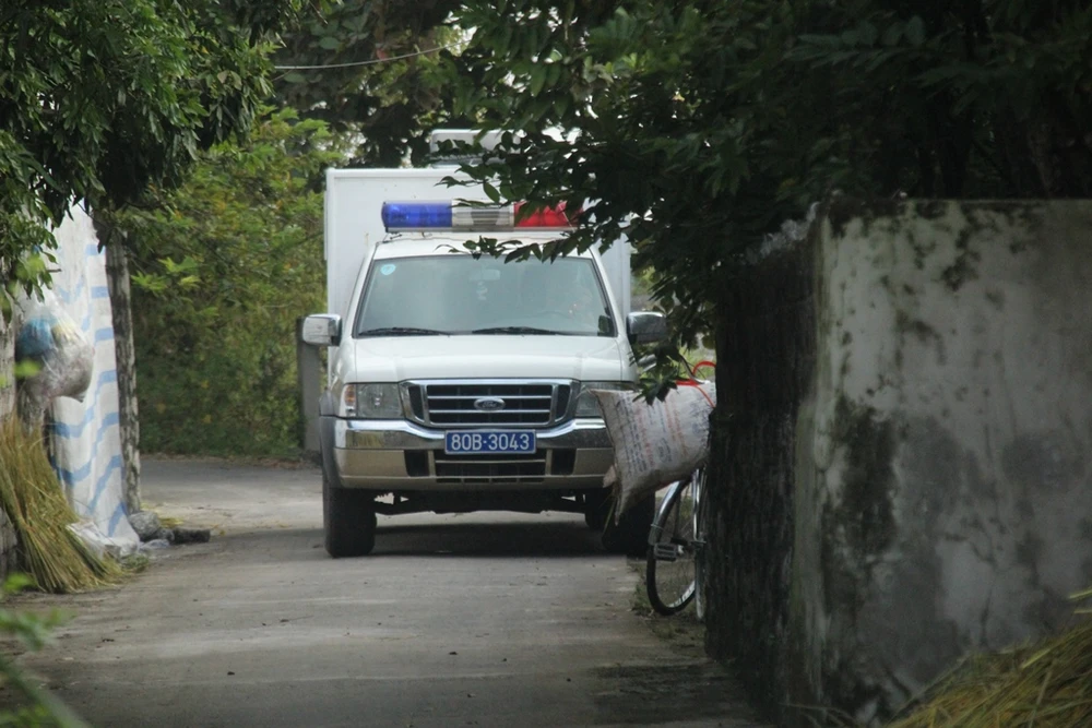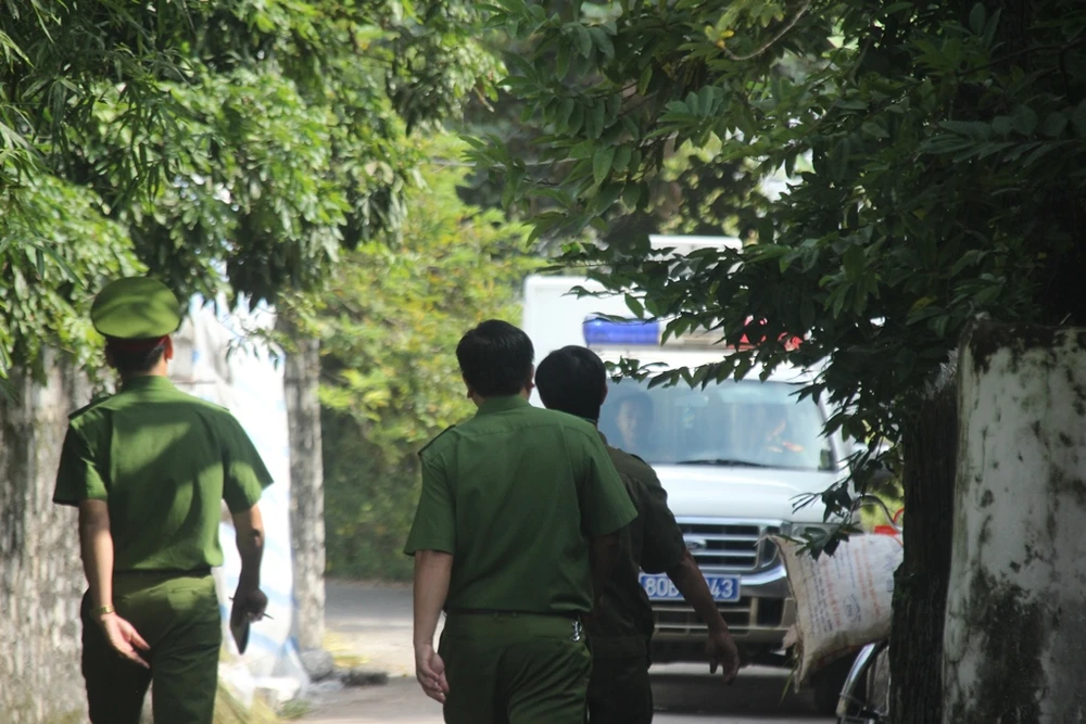 Một xe chuyên dụng cùng nhiều cán bộ cảnh sát đã tới nhà riêng của bị cáo Hùng