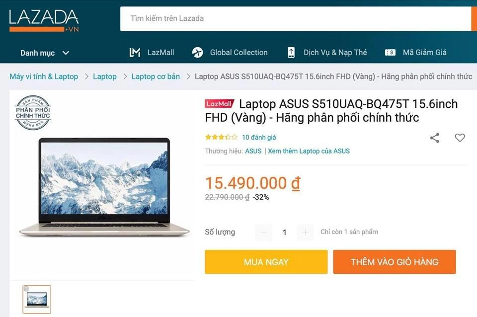 Giá bán của laptop ASUS này chỉ xấp xỉ 17 triệu đồng nhưng người bán tăng lên 22.790.000 đồng để giảm 32% còn 15.490.000 đồng.