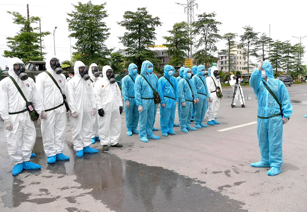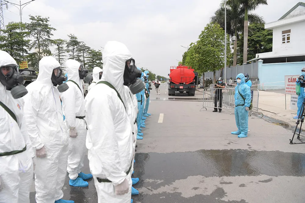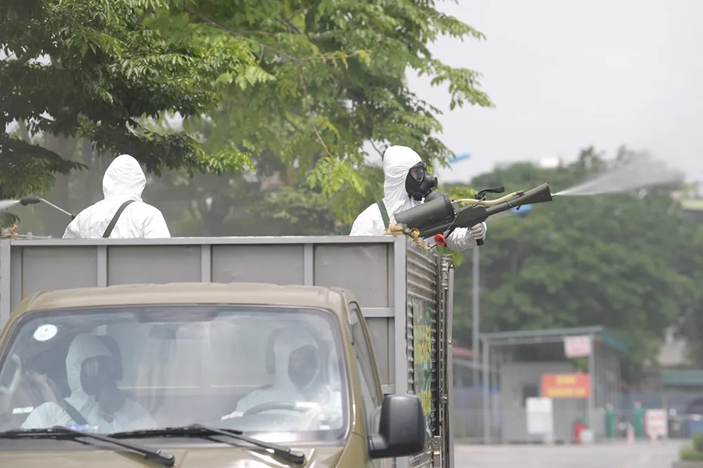 Các chiến sĩ của Bộ Tư lệnh Thủ đô tập trung nhận lệnh điều động tiến hành phun khử khuẩn tại Bệnh viện K (cơ sở Tân Triều, Thanh Trì)