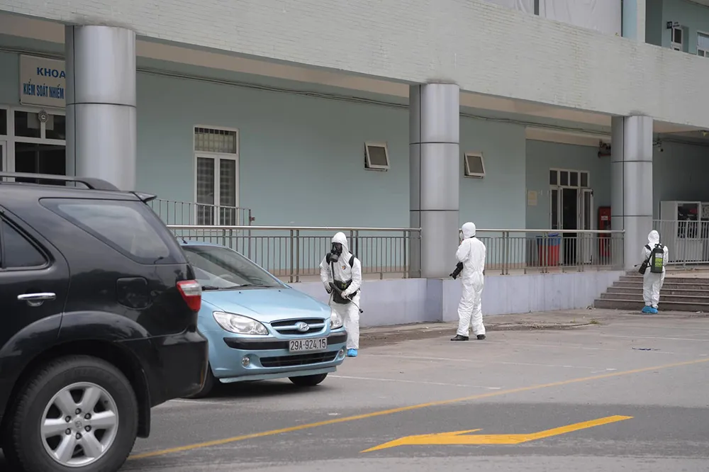 Cửa bệnh viện ngăn barie, có bảo vệ, công an thường trực. Bên trong lực lượng quân đội tiến hành phun khử khuẩn.