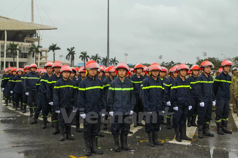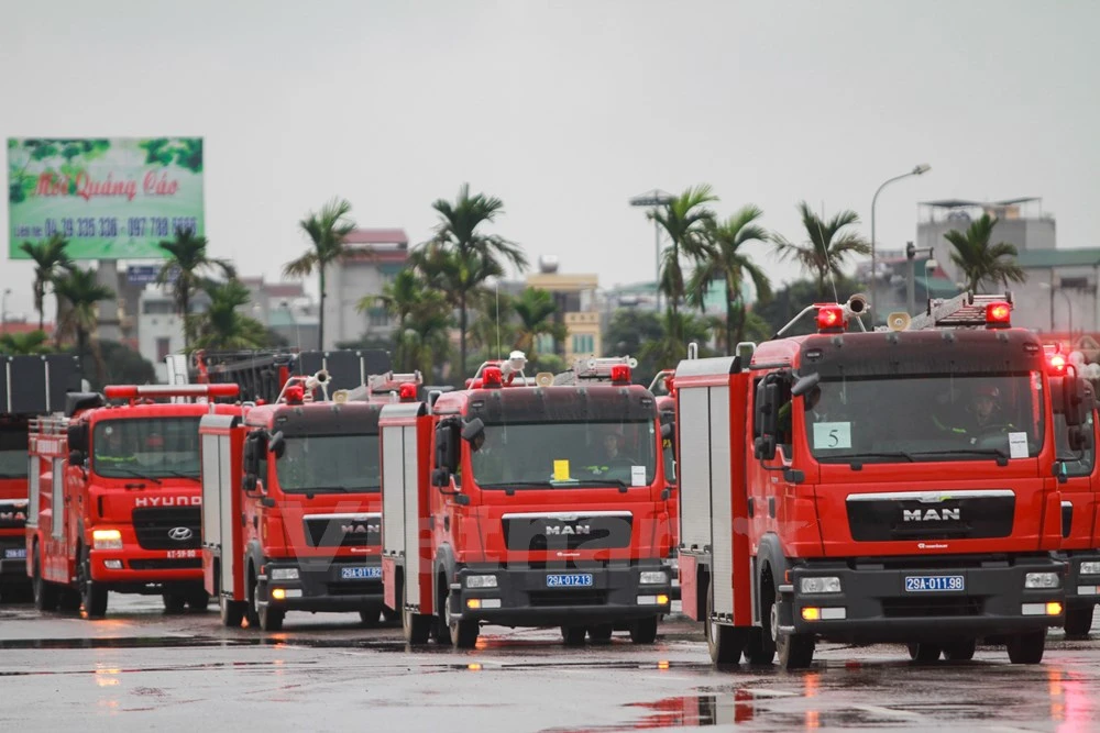 Khối xe Phòng cháy chữa cháy của Cảnh sát PC&CC Thành phố và Bộ Tư lệnh Thủ đô có sức chứa 4000-5000 lít nước và 400 lít bọt chữa cháy có lăng giá trên xe phun bọt với lưu lượng 1200 lít/phút tạo ra các cột nước cao đến 30 mét. (Ảnh: PV/Vietnam+)