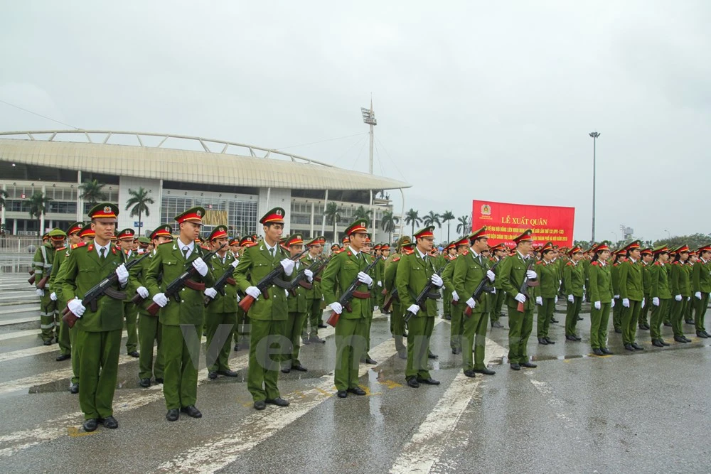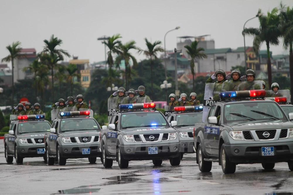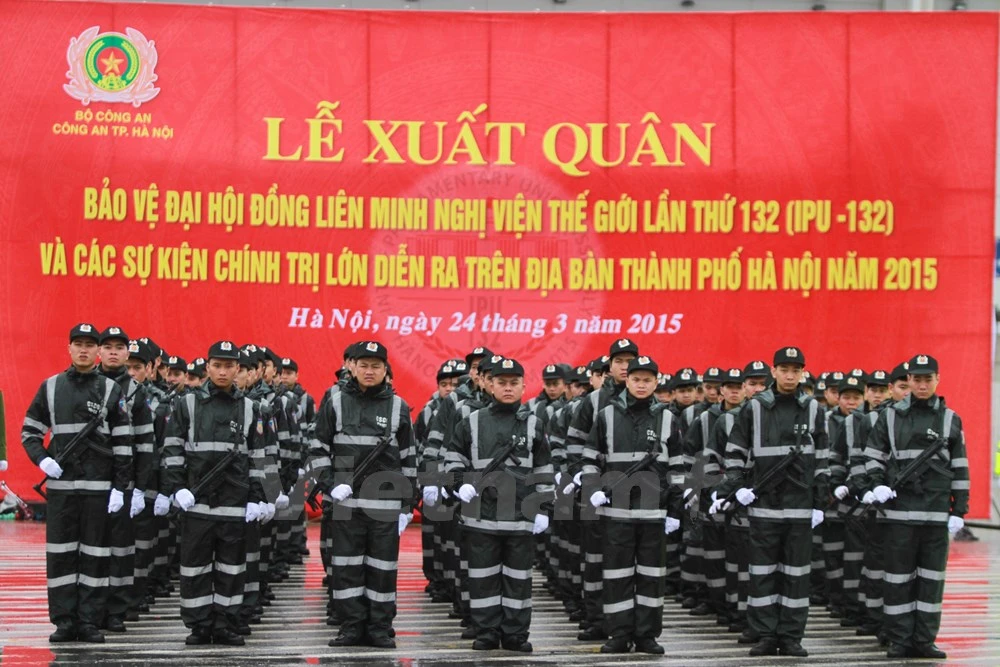 Chiều ngày 24/3, lễ xuất quân bảo vệ Đại hội đồng Liên minh Nghị viện thế giới lần thứ 132 của công an Thành phố Hà Nội diễn ra tại trước cửa sân vận động quốc gia Mỹ Đình. (Ảnh: PV/Vietnam+)
