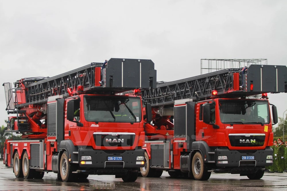 Hai xe thang chữa cháy chuyên dụng có tải trọng 24 tấn, thang xe có thể vươn đến 52 mét phục vụ công tác cứu hộ, cứu nạn. (Ảnh: PV/Vietnam+)