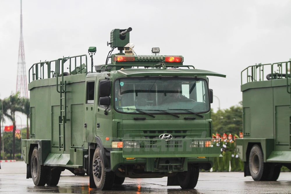 Xe phun nước dùng để xử lý các tình huống gây rối, biểu tình. Xe có dung tích thùng chứa 0,9 mét khối nước, trang bị bơm cao áp, vòi phun tự động với áp lực có thể làm mất sức kháng cự của đối tượng, nhanh chóng chia cắt giải tán đám đông bạo loạn trong thời gian ngắn. (Ảnh: PV/Vietnam+)