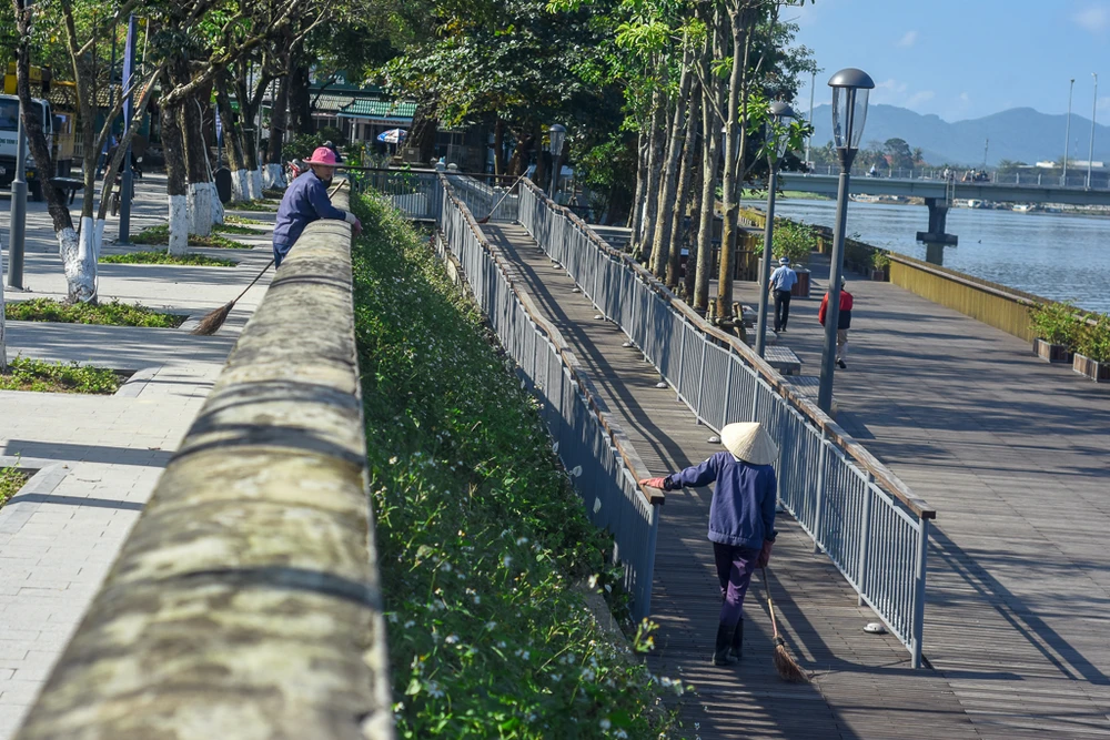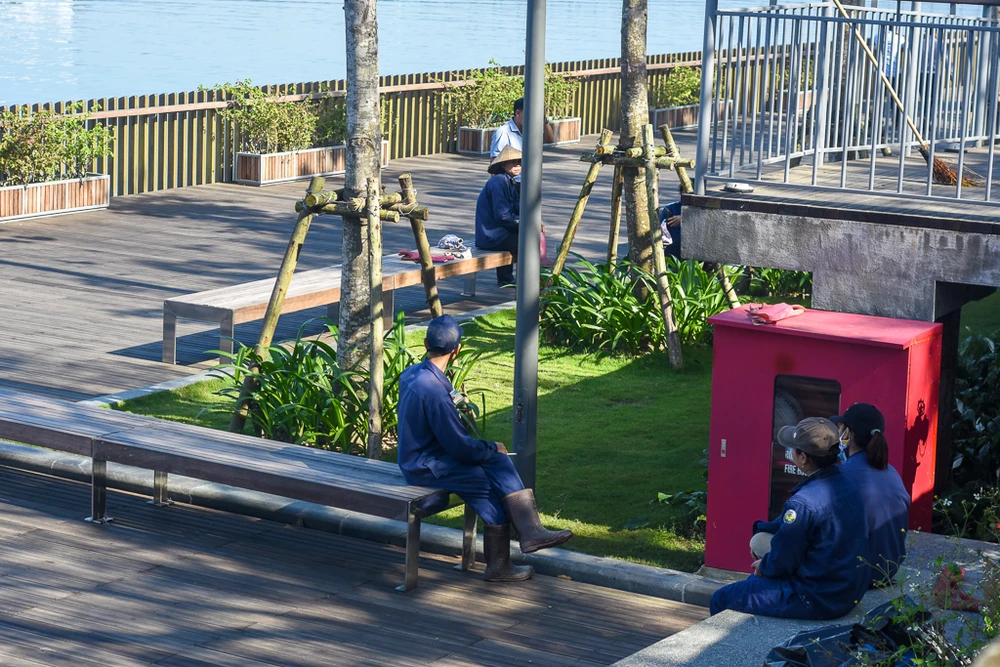 Phút nghỉ ngơi của những công nhân đang quét dọn, cắt tỉa cây trên đường đi bộ gỗ lim. Ảnh: NGUYỄN DO