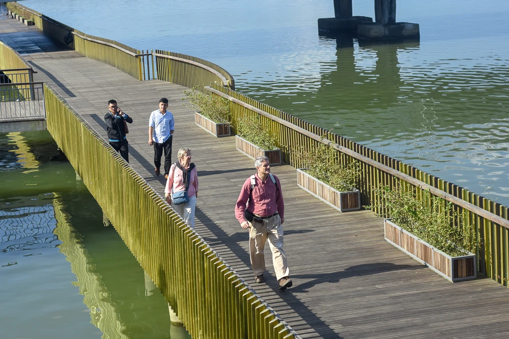 Cầu được lát bằng gỗ lim, trên tuyến đường có lắp đặt hệ thống đèn điện, vòi nước để phục vụ du khách và người dân. Ảnh: NGUYỄN DO