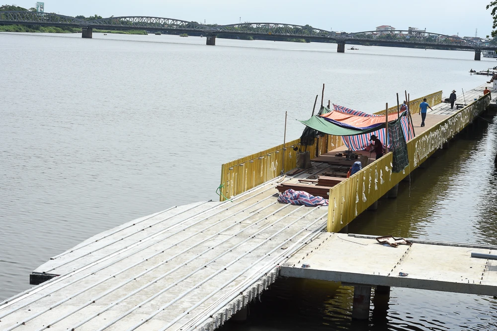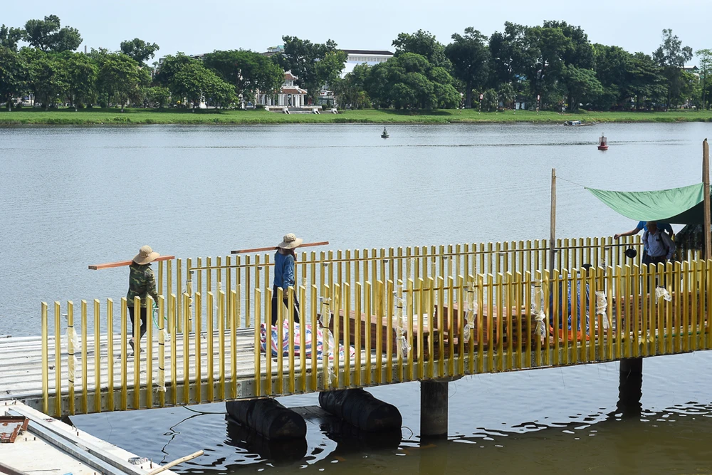 Sáng 13-7, những công nhân tiếp tục thực hiện việc lát các thớ gỗ lim trên con đường đi bộ trên sông Hương, tuyến đường này nằm trong dự án Xây dựng Mạng lưới kết nối hệ thống tuyến đường đi bộ phía Nam sông Hương, thành phố Huế do Tổ chức Koica (Hàn Quốc) tài trợ.