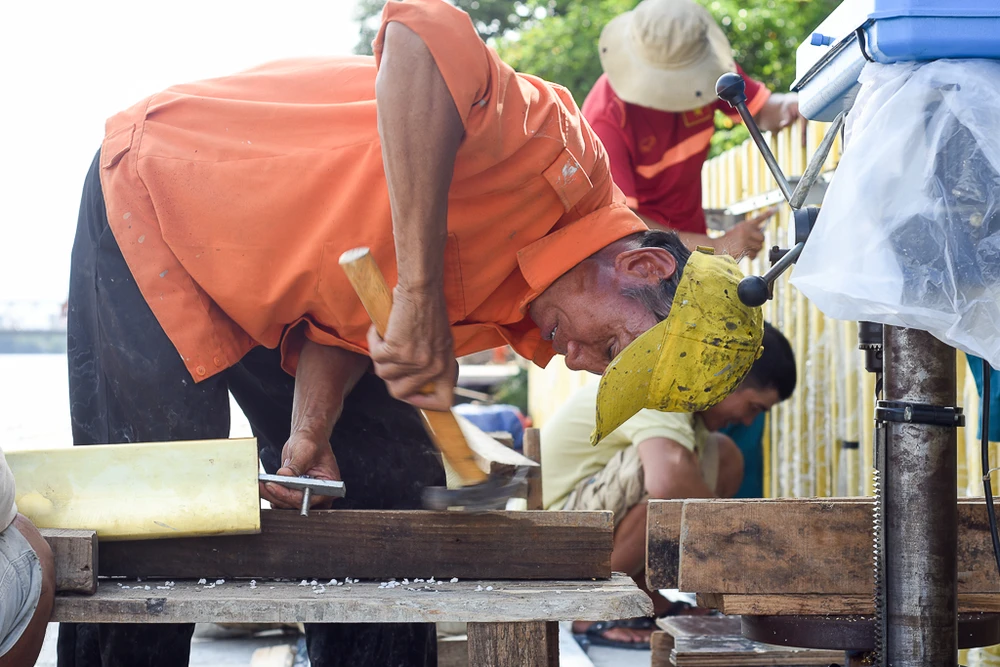 Dưới đây là một số hình ảnh về những thớ gỗ lim đầu tiên được lót tại đường đi bộ trên sông Hương.