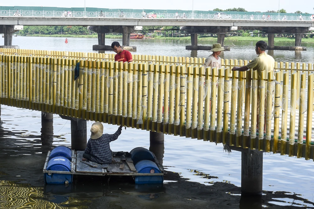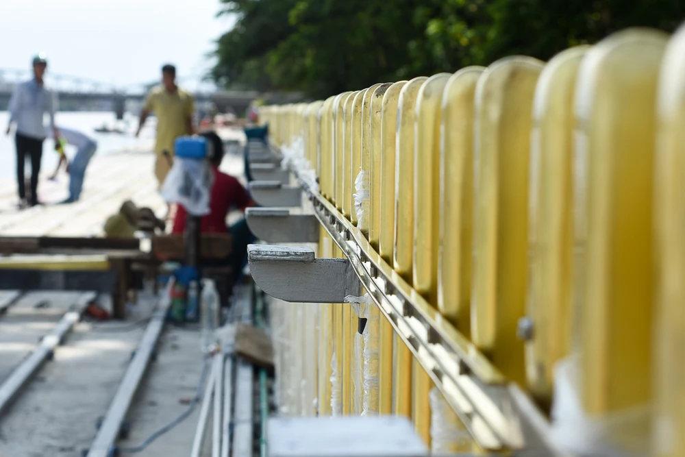 Công nhân đang lát gỗ lim và lắp đặt các lan can hai bên đường đi bộ. Ảnh: N.DO