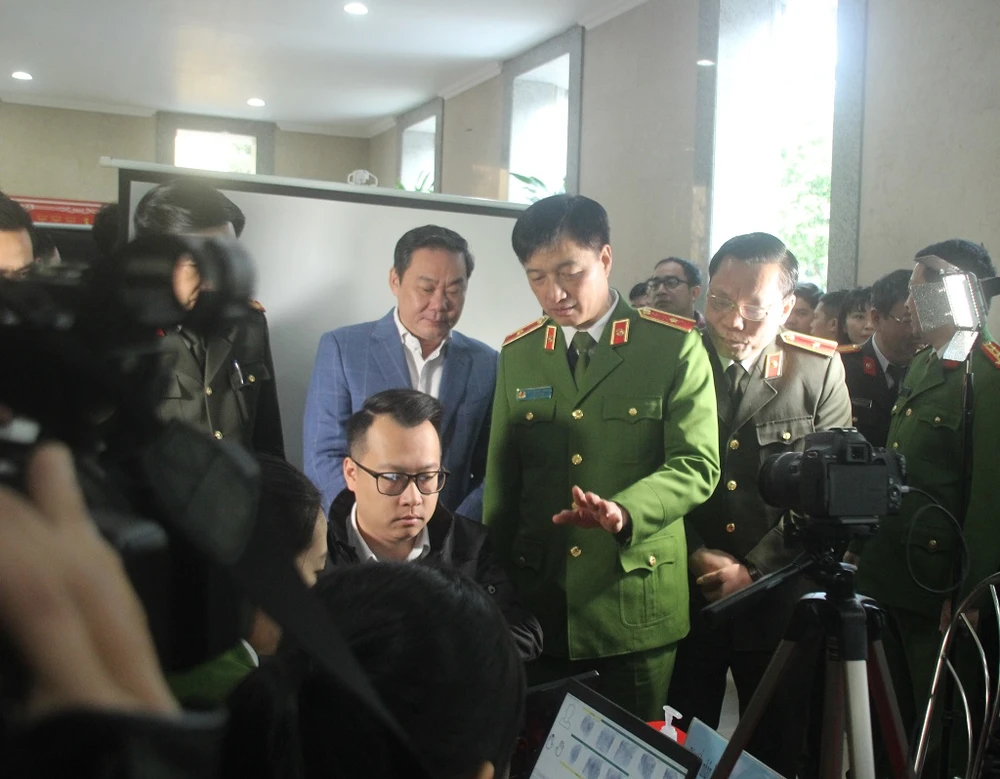 Thiếu tướng Nguyễn Duy Ngọc - Thứ trưởng Bộ Công an (giữa) cùng Giám đốc Công an TP Hà Nội (bên phải) có mặt tại ngày đầu tiên đơn vị này triển khai làm thủ tục cấp CCCD gắn chip cho người dân.