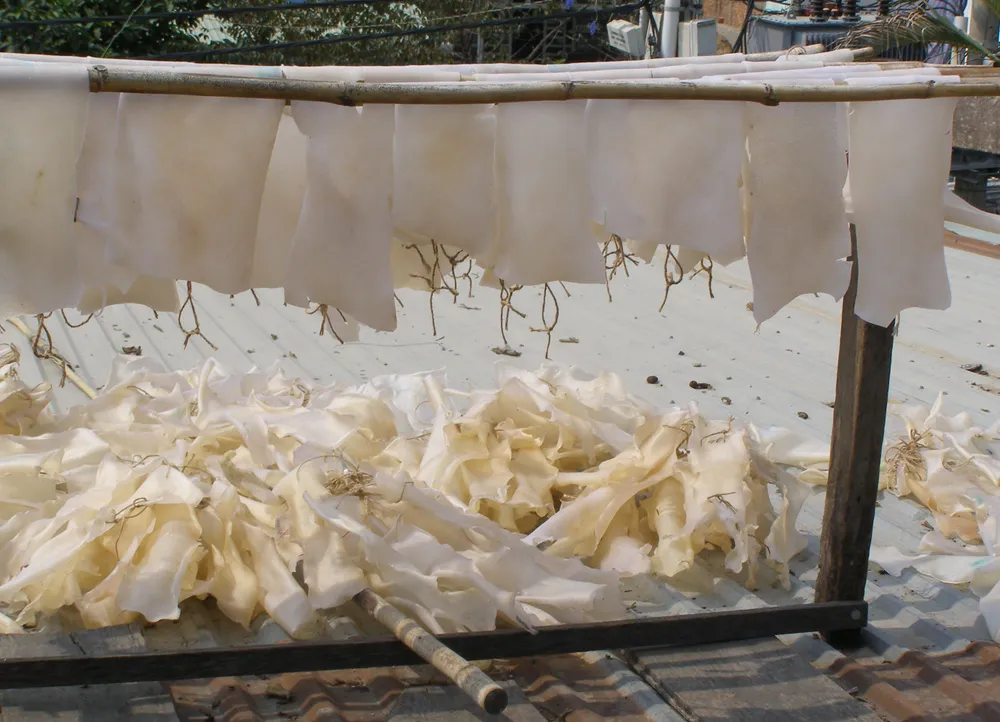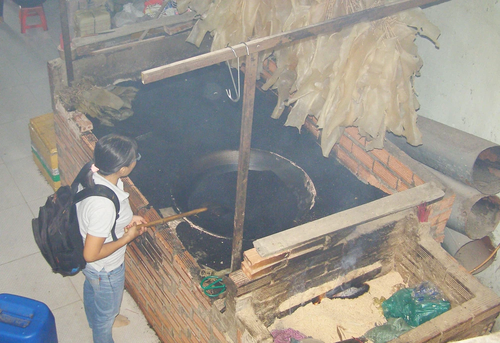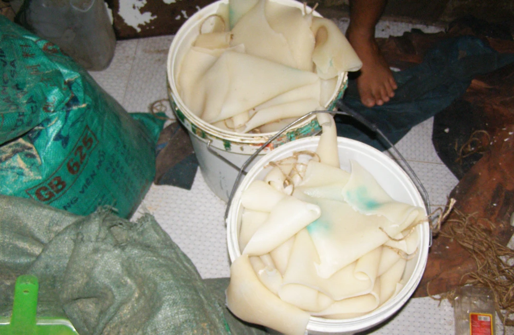 Bà Hằng cho biết da heo được mua ở chợ đầu mối Bình Điền (TP.HCM) với giá 29.000 đồng/kg, mang về rửa rồi ngâm trong thừng đựng ô xy già cho trắng và sạch máu. Tiếp theo luộc rồi phơi khô. Công đoạn cuối cùng là xào trong cát (loại cát dùng trong xây dựng) để da heo giòn, nở phồng. Cuối cùng là làm sạch cát dính trên da heo rồi cho vào bịch bán với giá 5.000 đồng/50 gr.