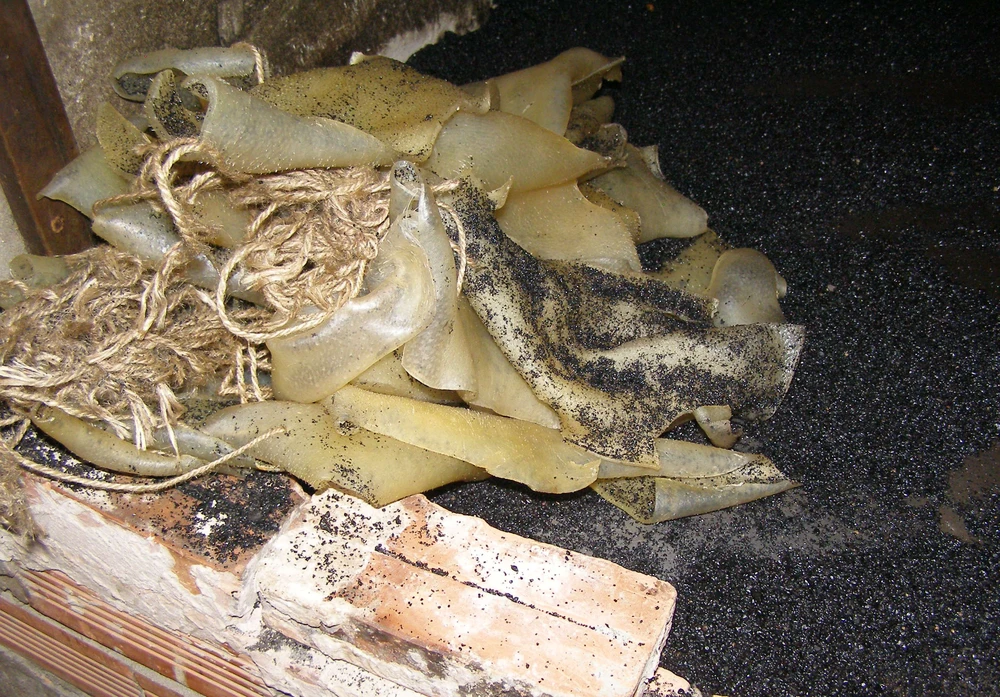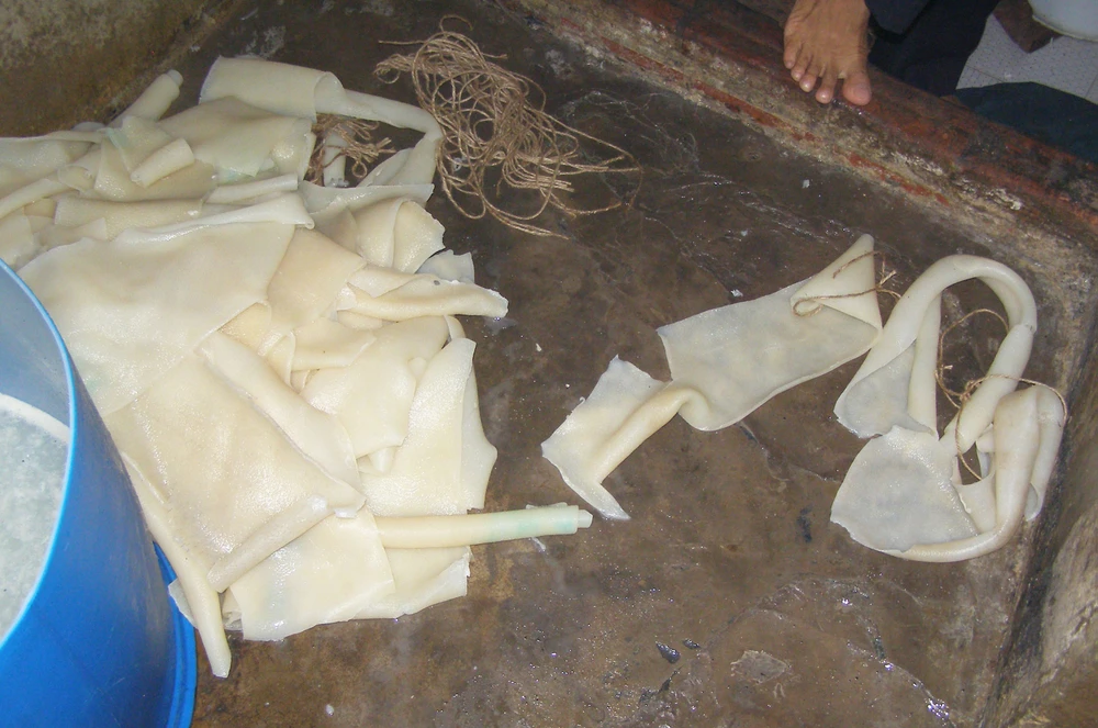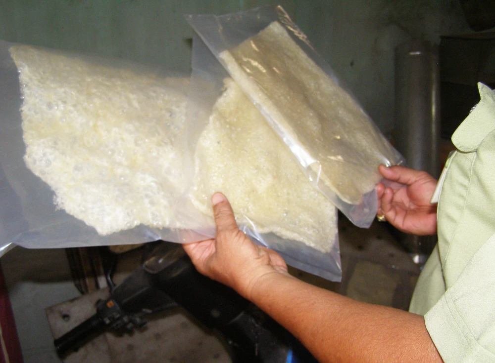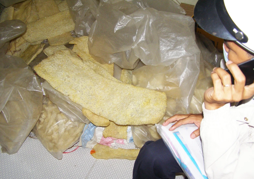 Có mặt tại thời điểm kiểm tra, PVghi nhận da heo để dưới nền đất đọng nước, hôi hám, cạnh nhà vệ sinh. Thùng ngâm da heo và nồi luộc da heo bốc mùi khó ngửi. Cát trong chảo chiên da heo cháy đen. Đoàn kiểm tra thu hồi toàn bộ nguyên liệu và da heo thành phẩm.