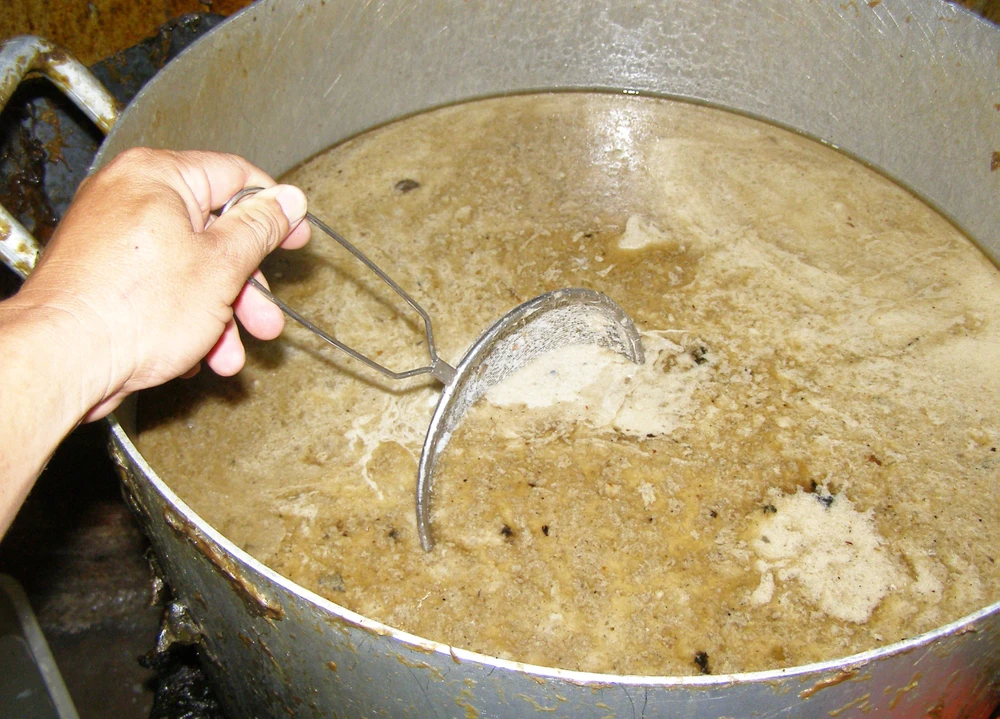 Nước luộc da heo đầy “vật thể lạ”, bốc mùi hôi.