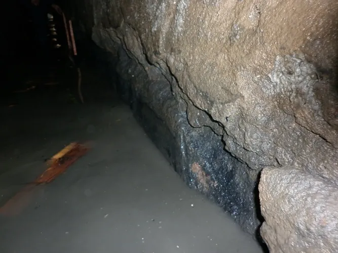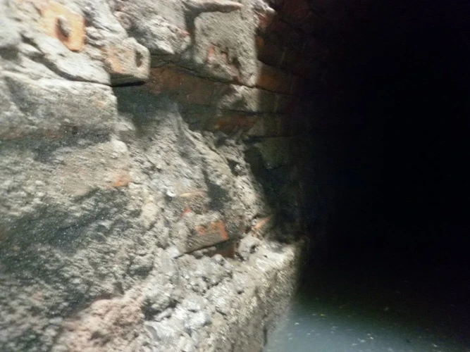 Hiện hệ thống cống vòm này đang trong tình trạng bị mất gạch vữa, vách bị nứt biến dạng, chân cống bị ăn mòn:
