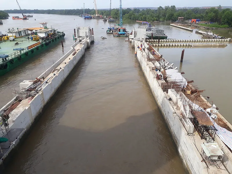 Âu thuyền của khu vực cống Cây Khô để tàu thuyền qua lại. Ngoài ra còn có kè phía xa của dự án được xây dựng.