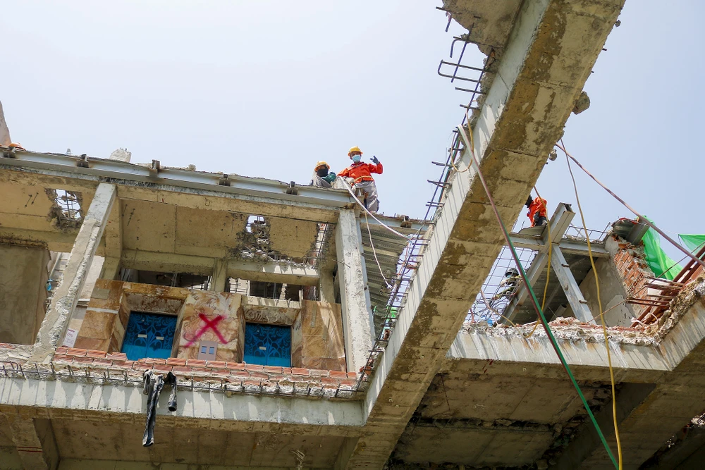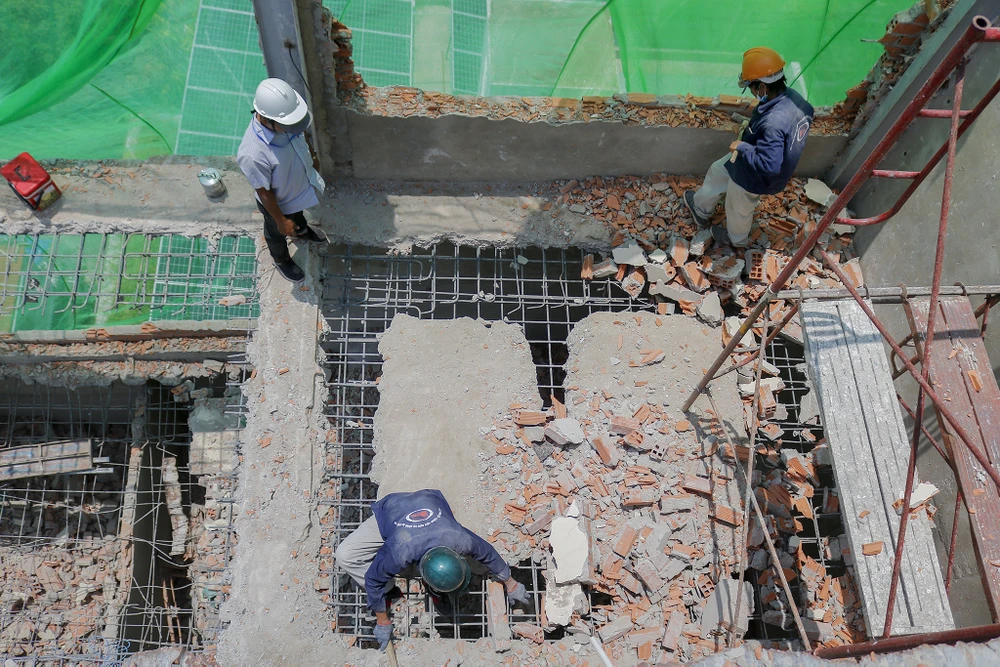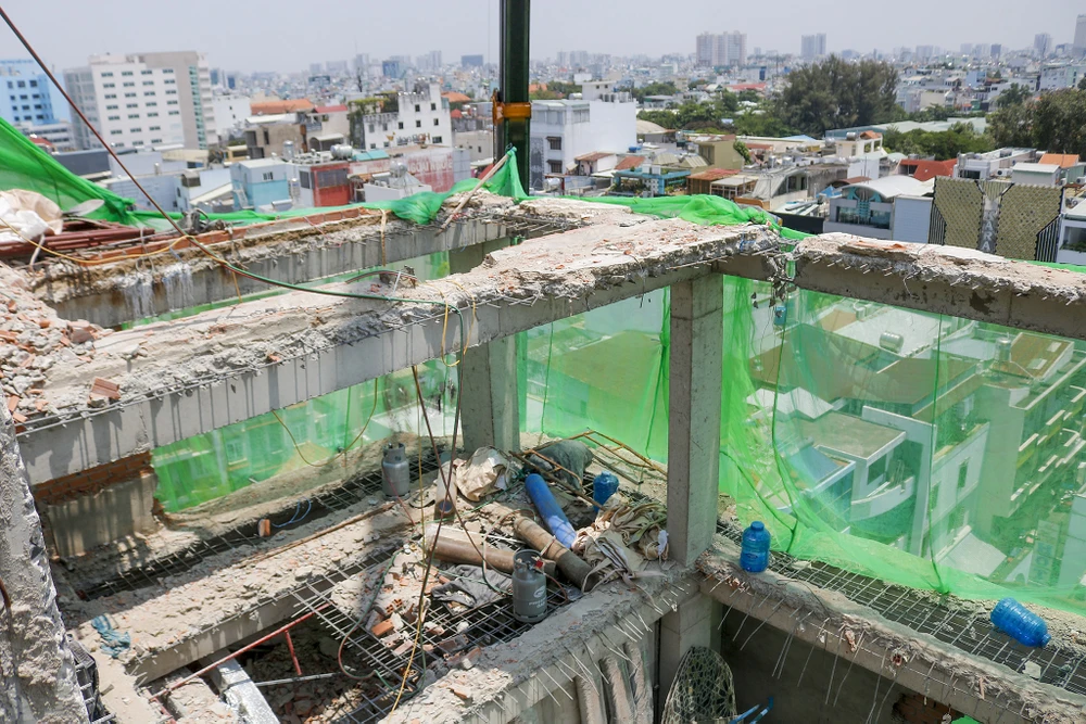 Trong sáng nay, các công nhân vẫn tiếp tục đục, cắt từng mảng bê tông tại tầng 8, 9 của căn nhà này vì xây dựng vượt tầng.
