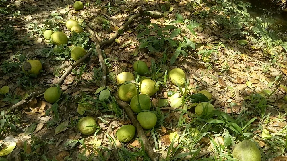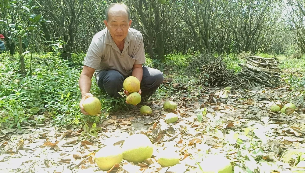 Ông Lâm buồn rầu nhặt những quả bưởi rụng