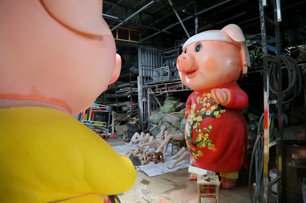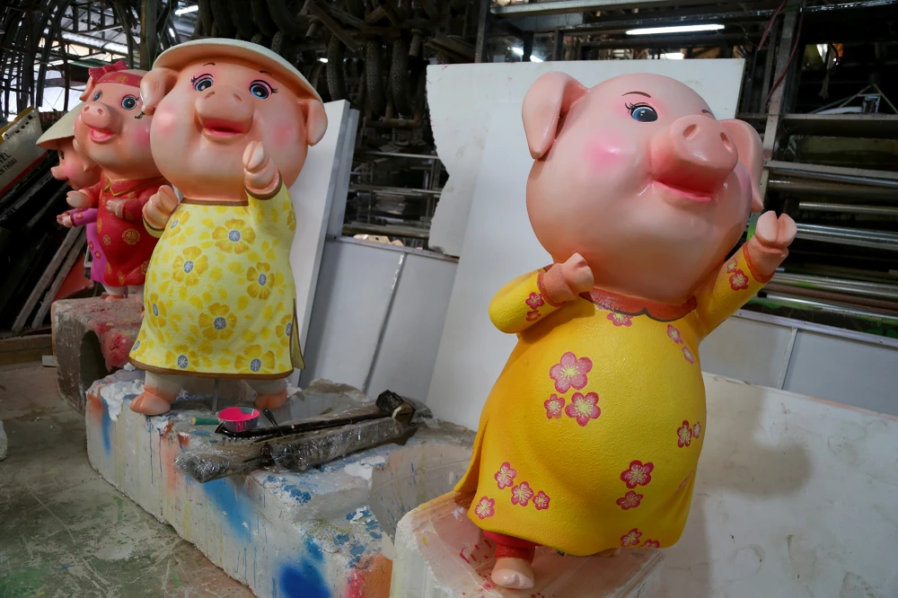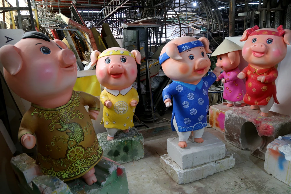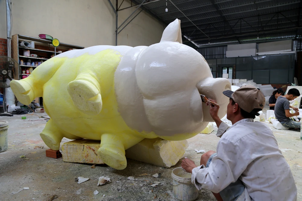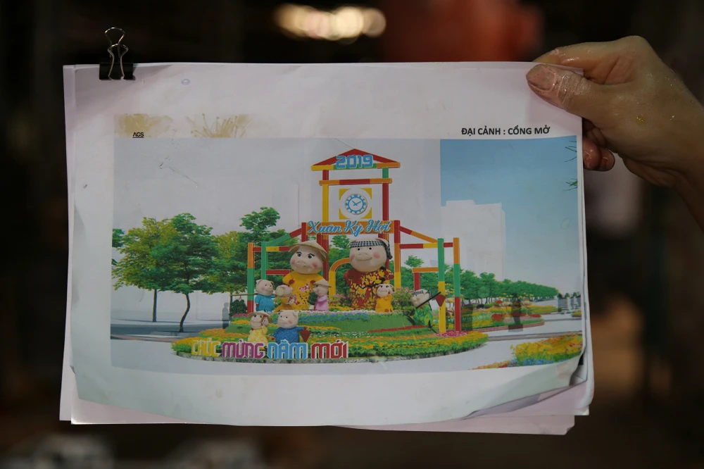 Chị Nguyễn Thị Thanh Thúy (con gái nghệ nhân Văn Tòng) cho biết xưởng bắt đầu thi công đàn heo cho đường hoa Nguyễn Huệ Tết Kỷ Hợi 2019 từ đầu tháng 12-2018 đến nay.