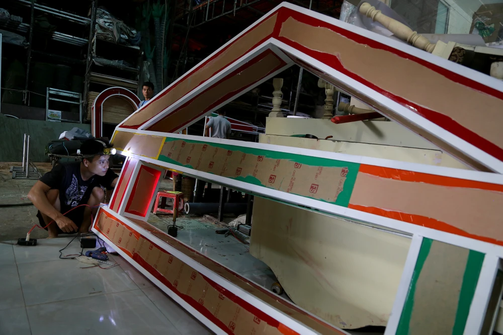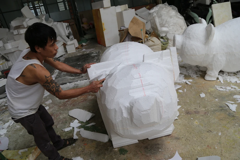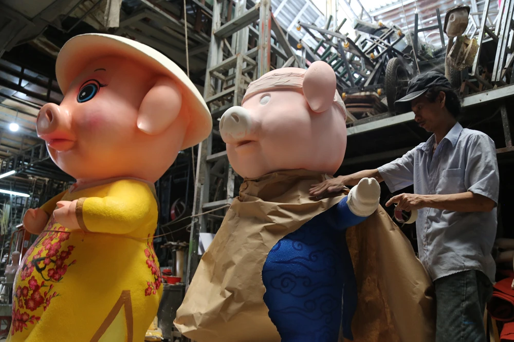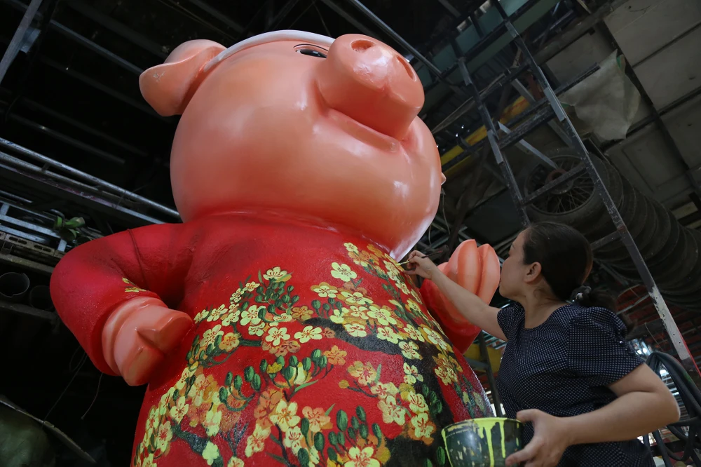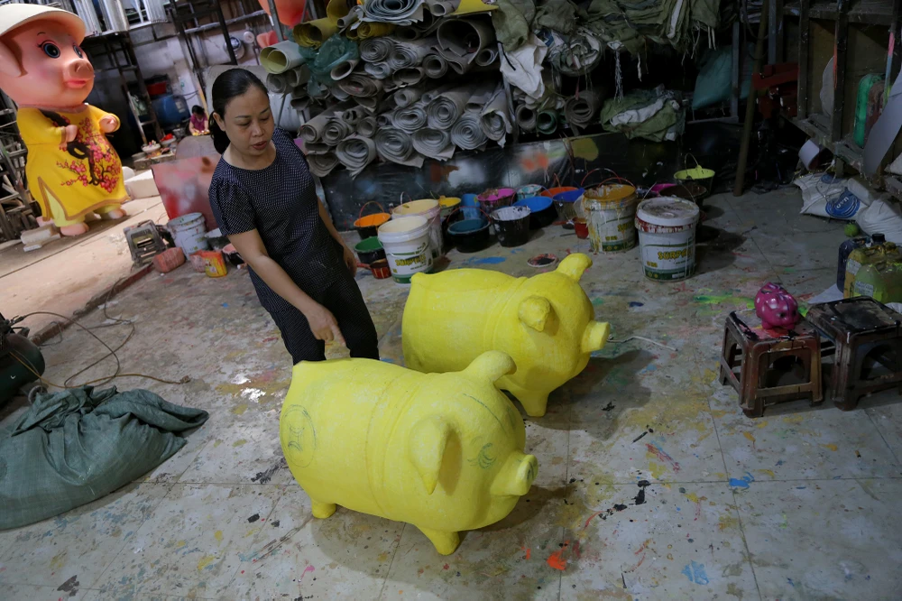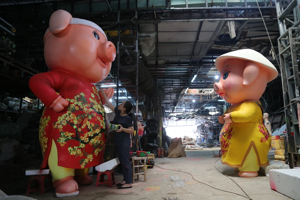 Chị Nguyễn Thị Thanh Thúy (con gái nghệ nhân Văn Tòng) cho biết xưởng bắt đầu thi công đàn heo cho đường hoa Nguyễn Huệ Tết Kỷ Hợi 2019 từ đầu tháng 12-2018 đến nay.