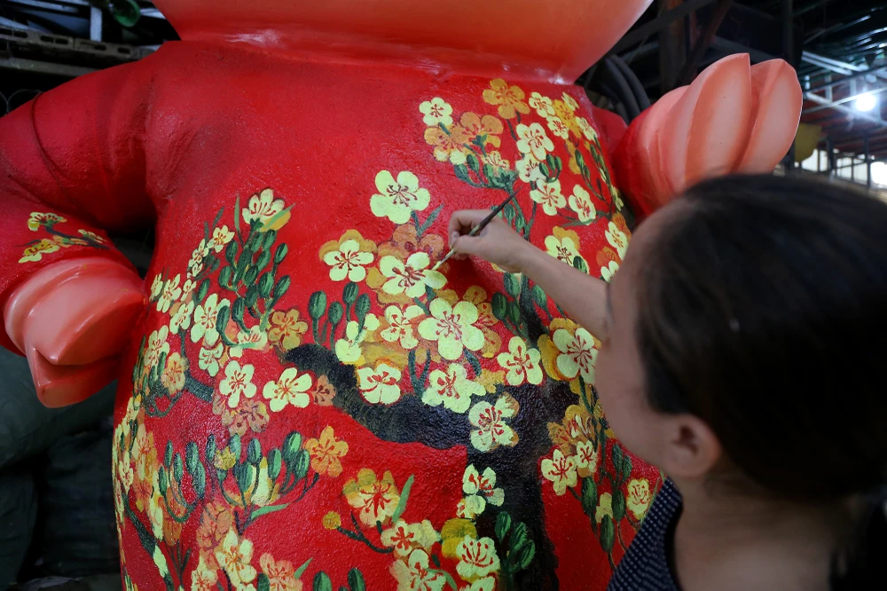 Hơn chục công nhân thi công tất bật mỗi ngày. Đến nay, tiến độ thi công đàn heo linh vật đã hoàn tất trên 70%.