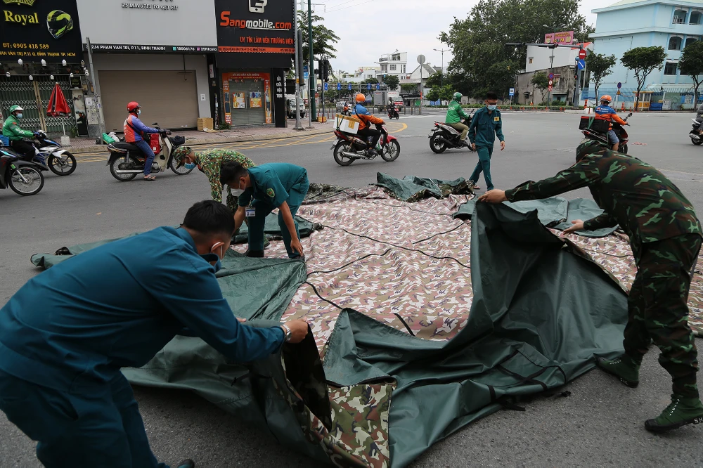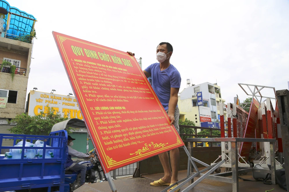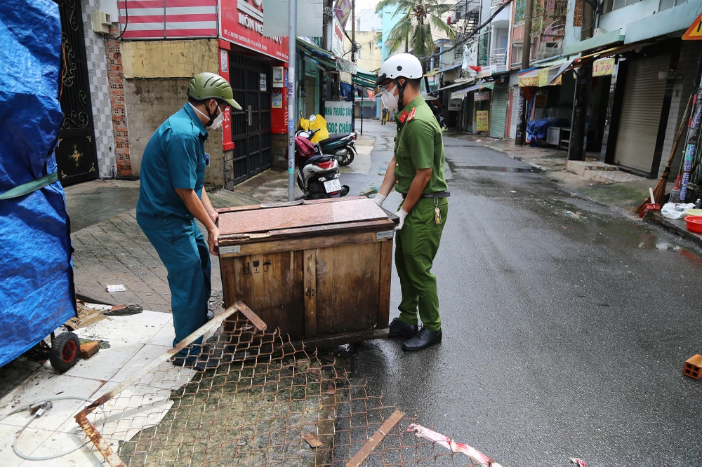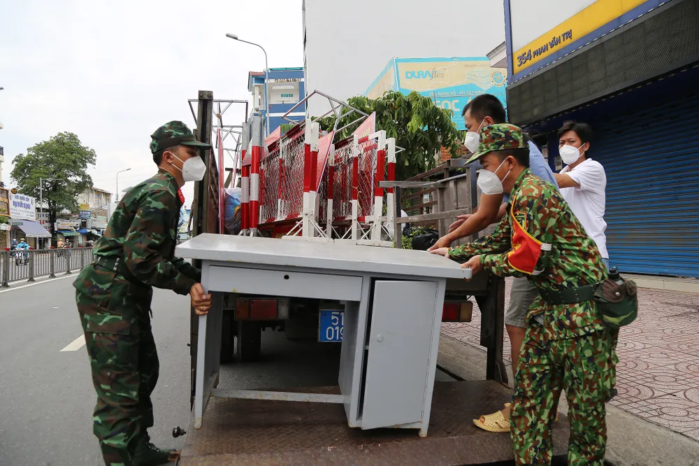 Lực lượng chức năng đang tháo dỡ các chốt, trạm kiểm soát trên đường Phan Văn Trị, quận Gò Vấp.