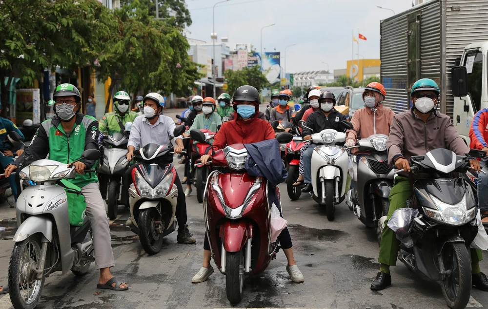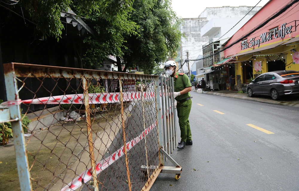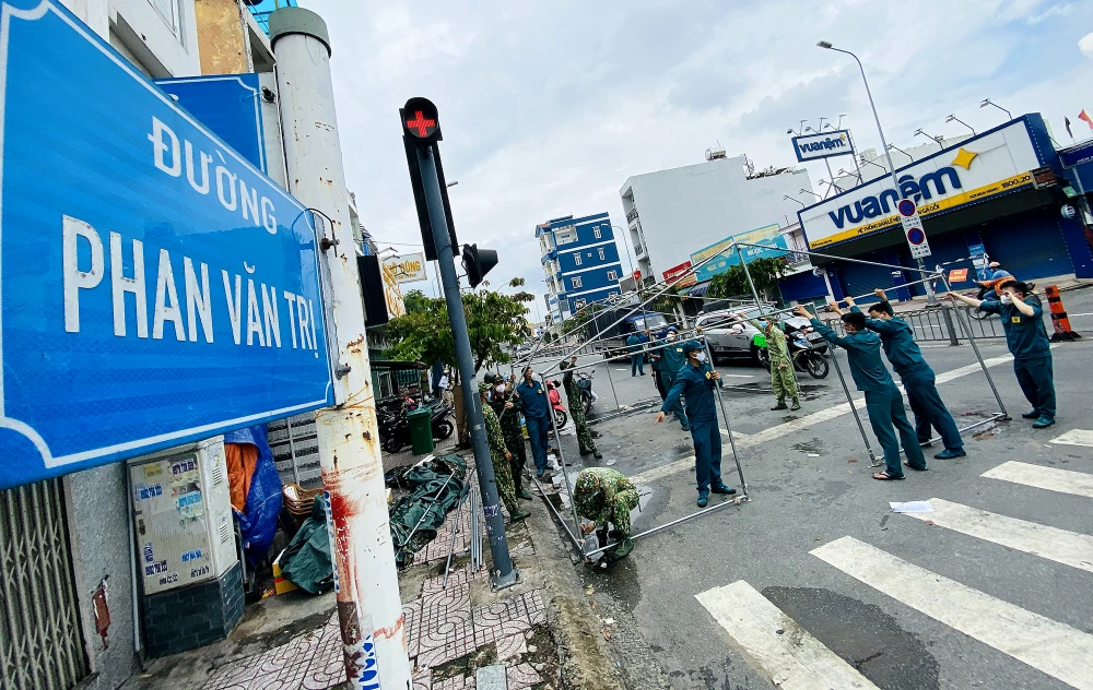 Lực lượng chức năng đang di chuyển các chốt, trạm kiểm soát trên đường Phan Văn Trị, quận Gò Vấp.