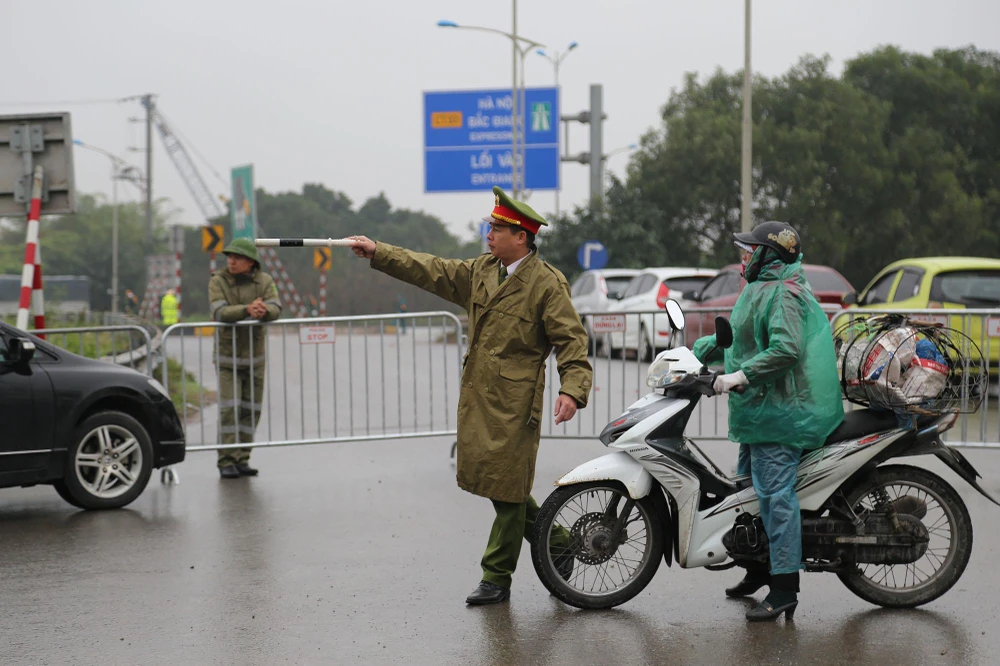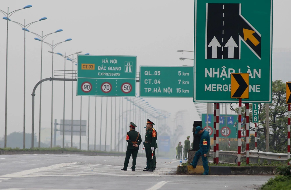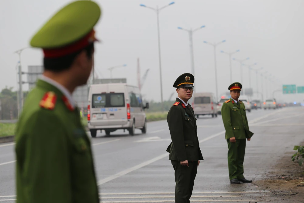 Cảnh sát túc trực hai bên đường dọc từ Lạng Sơn về trung tâm Hà Nội.