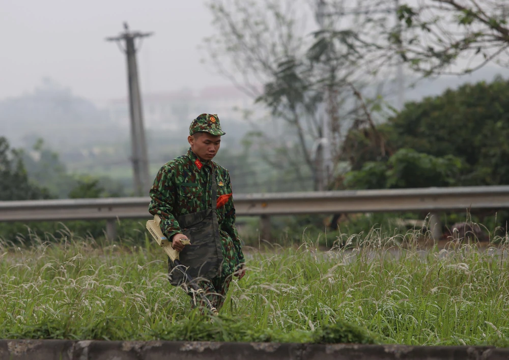 Công binh rà bom mìn dọc quốc lộ 1A về Hà Nội trước giờ đoàn xe đi qua.