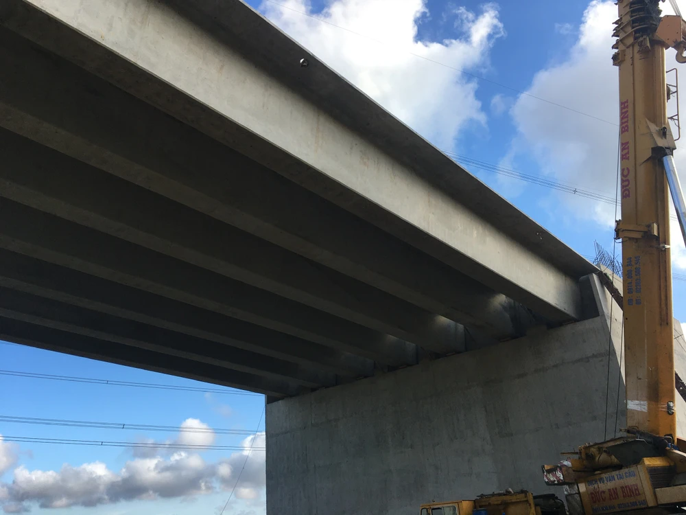 Dự án đã lao lắp xong bốn nhịp với 28 phiến dầm Super - T của cầu Km.137+810. Ảnh: CTV.