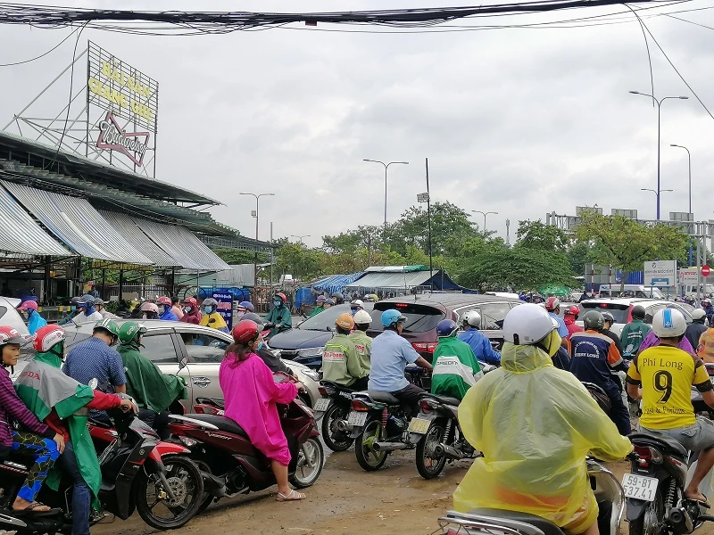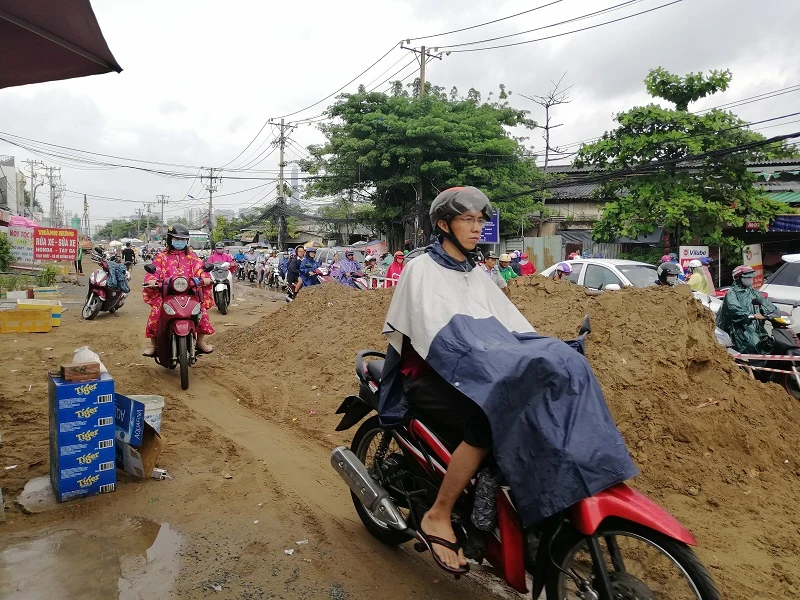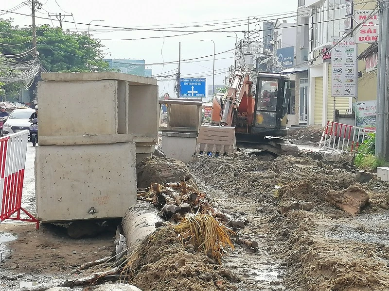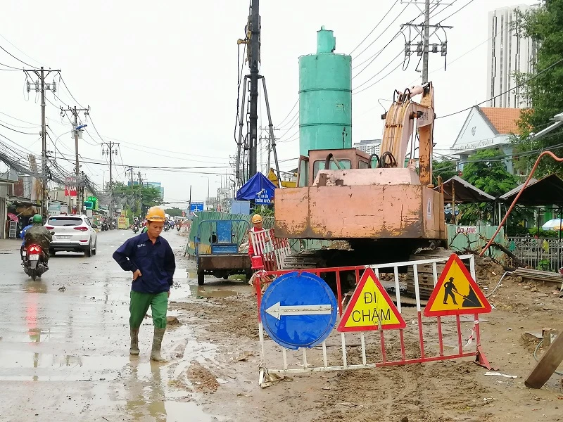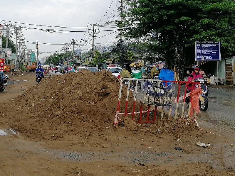 Theo quan sát của PV, công trình đã vắng bóng công nhân mặc dù máy móc, vật liệu xây dựng vẫn xếp ngổn ngang. Mặt đường tồn đọng những ụ đất lớn, kẹt xe, ngập nước và các tấm biển giới thiệu đã phai trắng… là hệ quả của việc ngưng trệ thi công dự án nâng cấp đường Lương Định Của.