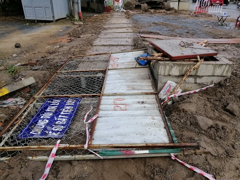Hai bên đường dọc nhà dân xuất hiện từng dãy hố sâu 2-3 m được đậy lại bởi hàng rào chắn công trình.