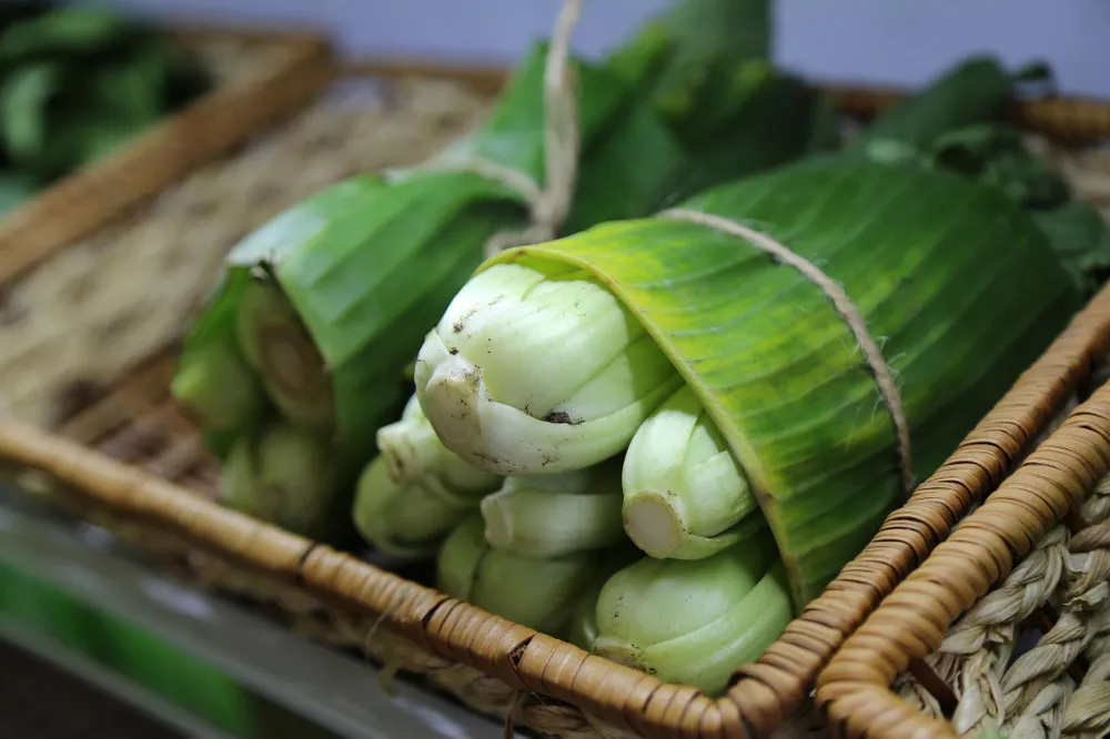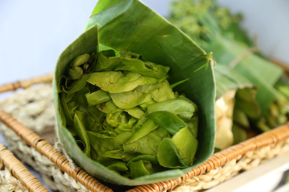 Những bó rau được gói bằng lá chuối dân dã như những sản vật ở chợ quê.