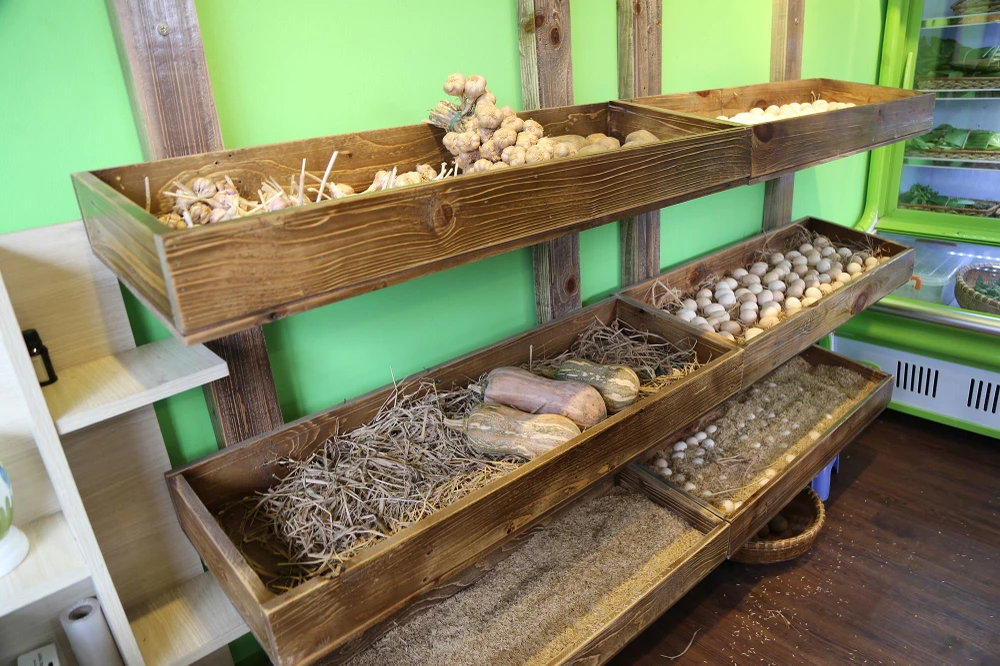 Bên cạnh gói lá chuối, các kệ rau củ của tiệm này đều được làm bằng gỗ và đặt trên những chiếc rổ bằng mây tre như kiểu thôn quê.