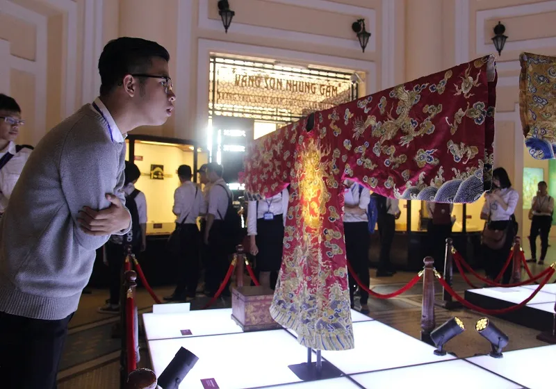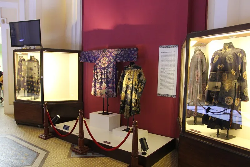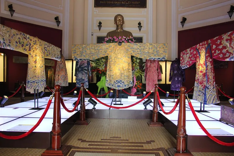 Triển lãm Vàng son nhung gấm - Trang phục cung đình triều Nguyễn giới thiệu 70 hiện vật gồm trang phục và đồ trang sức. Chuyên đề triển lãm này được kết hợp giữa hiện vật của Bảo tàng Lịch sử TP.HCM, Bảo tàng Phụ nữ Nam Bộ và một số nhà sưu tập tư nhân.