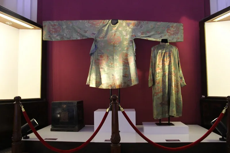Trong hai chiếc hoàng bào của vua Đồng Khánh, có một chiếc thường triều lúc ông còn là hoàng thái tử và một chiếc thường triều lúc ông đã lên ngôi. Trong ảnh là chiếc áo khi ông còn là hoàng thái tử.