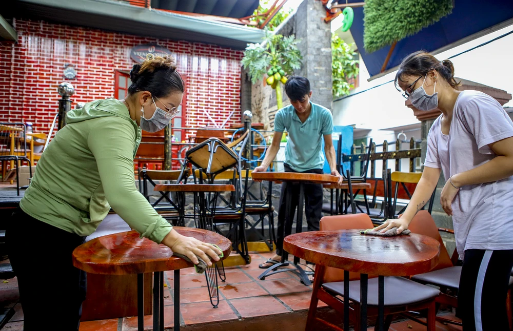Từ ngày 1-10, TP.HCM cho phép mở lại một số loại hình kinh doanh, dịch vụ. Nhiều chủ cửa hàng và nhân viên các quán cà phê, quán ăn tất bật lau dọn, sắp xếp bàn ghế sau nhiều tháng liền đóng cửa vì dịch bệnh.