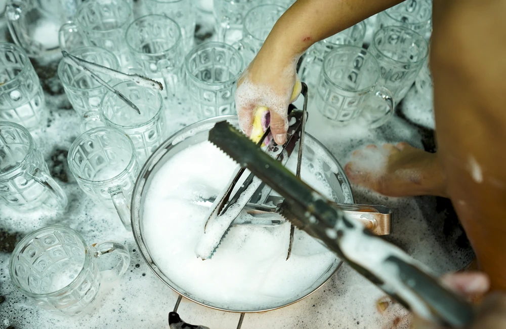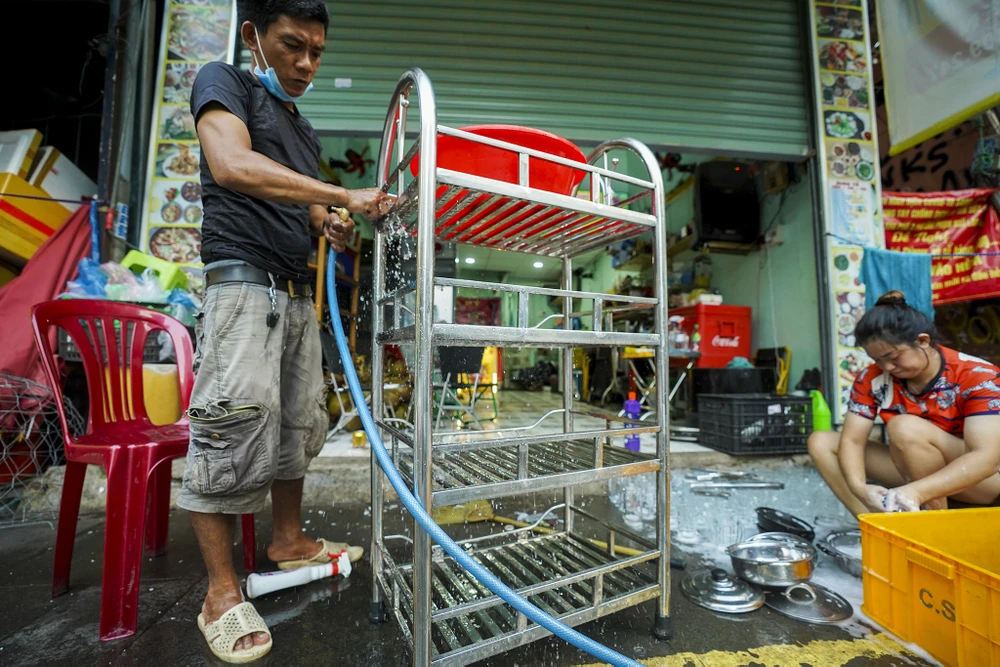 Cứ cách tuần, gia đình anh Hòa (chủ quán) lại mang đồ đạc ra lau rửa, anh cho biết từ khi TP.HCM giãn cách theo chỉ thị 16, những hộ như anh phải cố bám trụ, chịu tổn thất khi phải trả tiền mặt bằng trong nhiều tháng liền ngưng hoạt động.