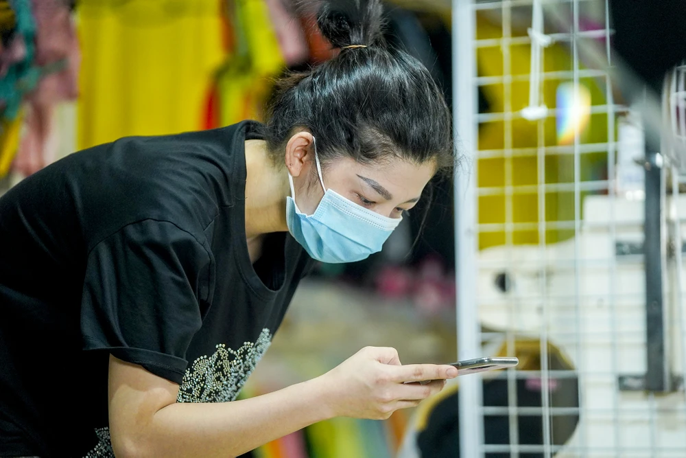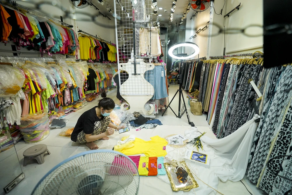 Chị Bảo Xuyên, nhân viên cửa hàng thời trang đang chụp các mẫu váy áo để giới thiệu lên fanpage của cửa hàng, bước đầu triển khai việc bán hàng trực tuyến.