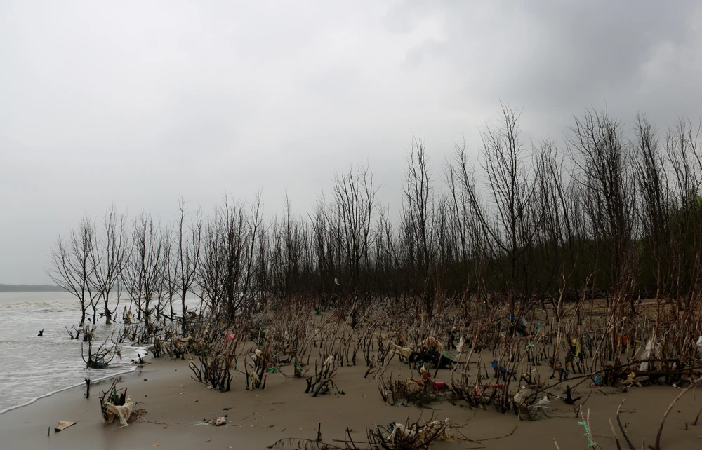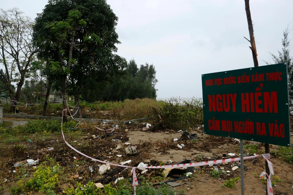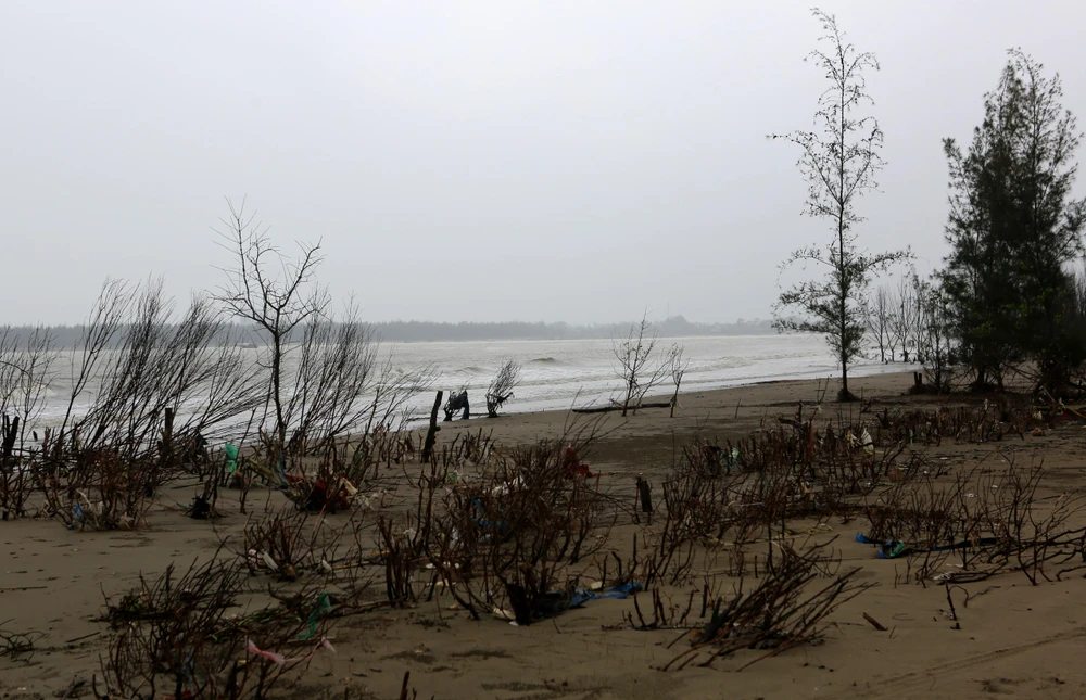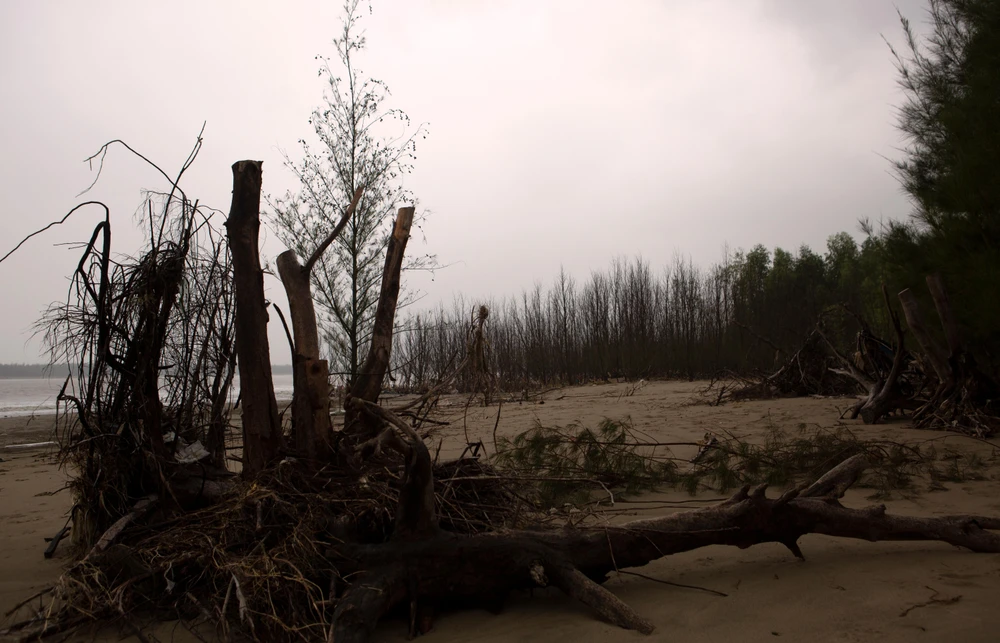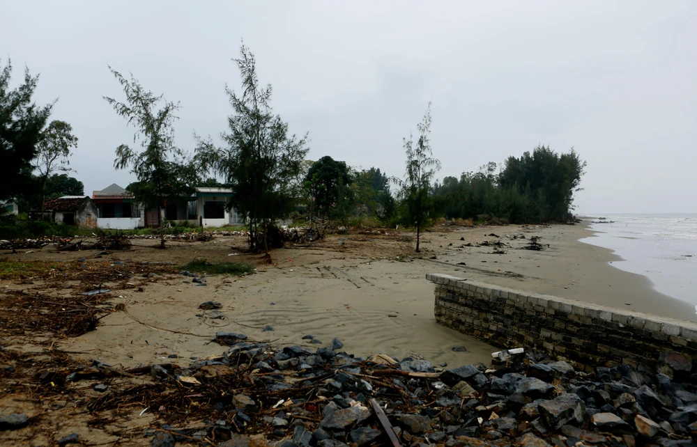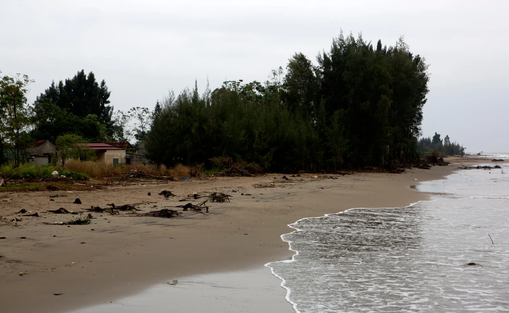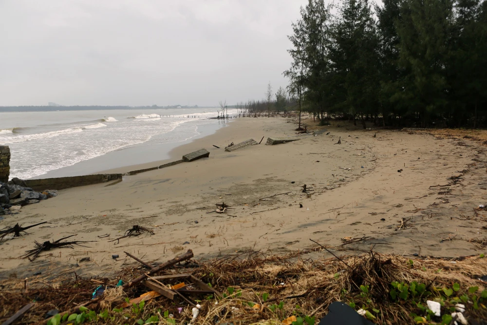 Người dân địa phương cho biết xâm thực với tốc độ nhanh nên chỉ trong thời gian ngắn cả rặng cây phi lao đã trụi lá, chết khô, bật gốc bên bờ biển.