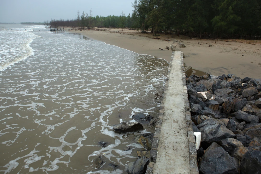 Sóng biển còn đẩy cát lấn sâu vào bên trong vượt qua tường chắn sóng bên trong, đe dọa làng Tân Xuân.